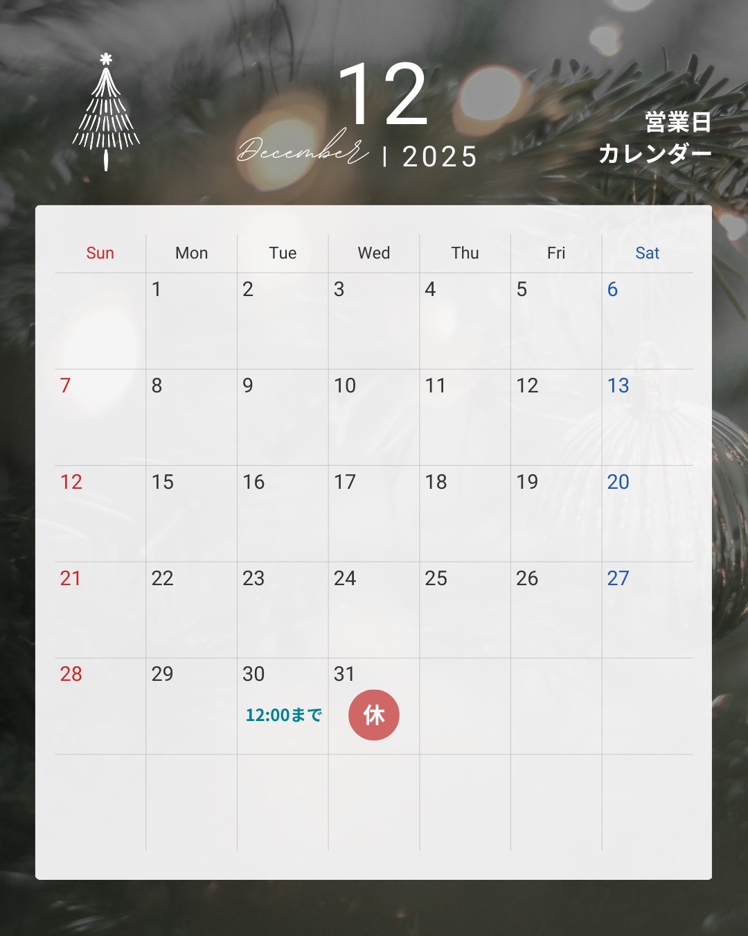 🎄⛄️年末年始営業日❄️🎍 12月30日 12:00まで 12月31日~1月4日 休診 1月5日~ 通常診療